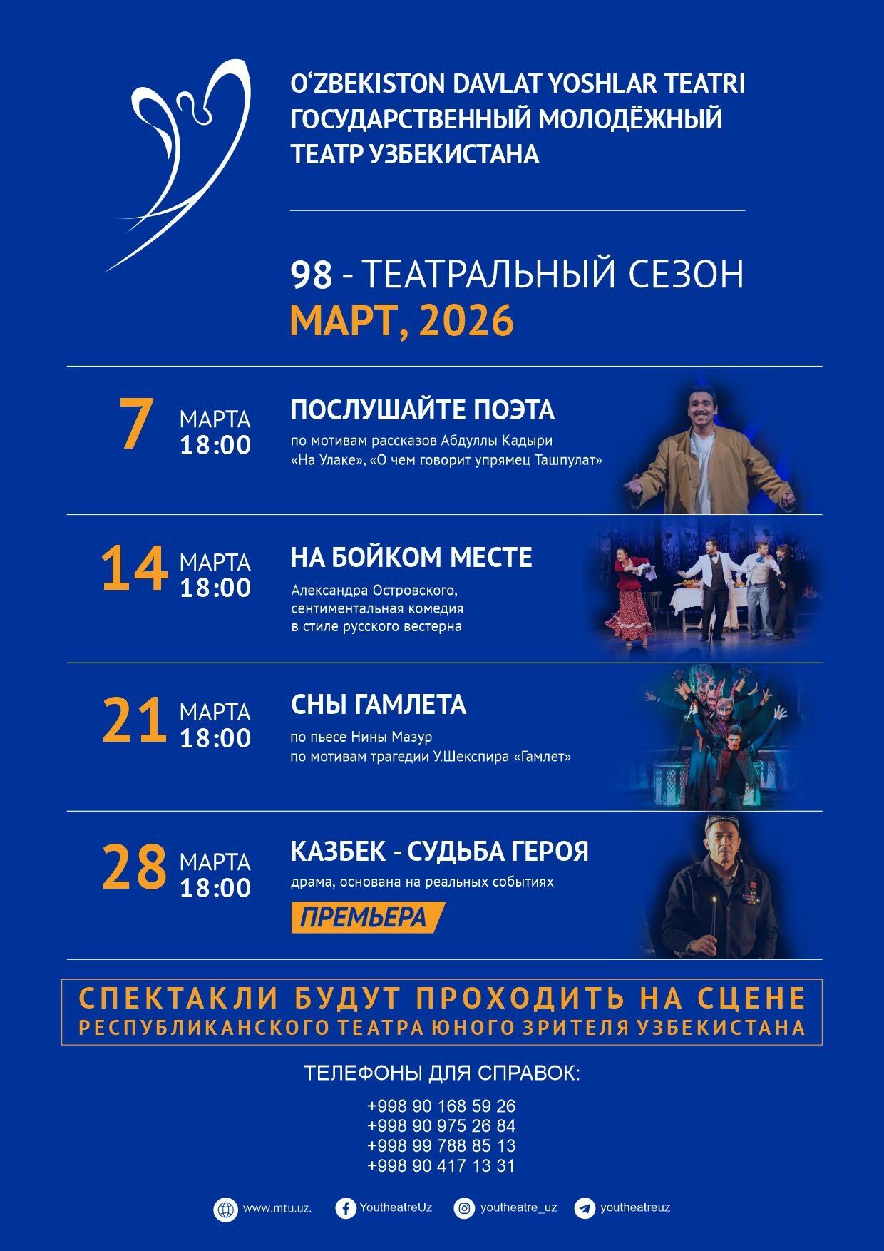 🎭 ГОСУДАРСТВЕННЫЙ МОЛОДЁЖНЫЙ ТЕАТР УЗБЕКИСТАНА ПРЕДСТАВЛЯЕТ РЕПЕРТУАР НА МАРТ 2026!